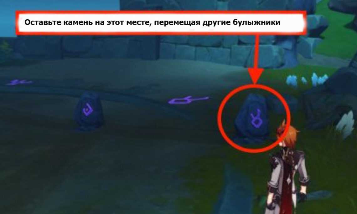 Чтобы упростить решение головоломки, мы советуем оставить камень с символом, показанным выше, в отмеченном месте. Тем самым вам удастся без проблем передвигать все булыжники, расставив их в нужные места. На втором изображении показан готовый вариант.