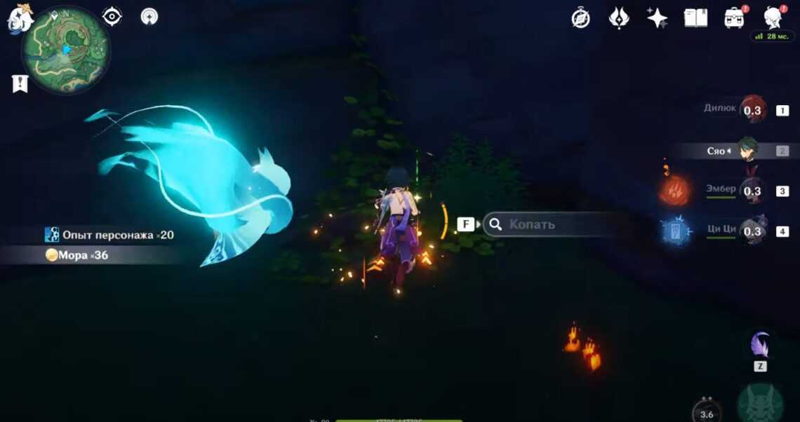 Возьмите ее и снова следуйте за феей, которая приведет вас назад к статуе птицы. Поместите табличку в место, показанное на скриншоте ниже. Затем следуйте за вторым духом. Поднимите очередной артефакт и вернитесь назад, чтобы активировать постамент. Теперь бегите за третьей феей. Карабкайтесь за ней наверх по скале. Разберитесь с двумя хиличурлами и выкопайте нужный предмет. Их расположение показано на скриншотах ниже.