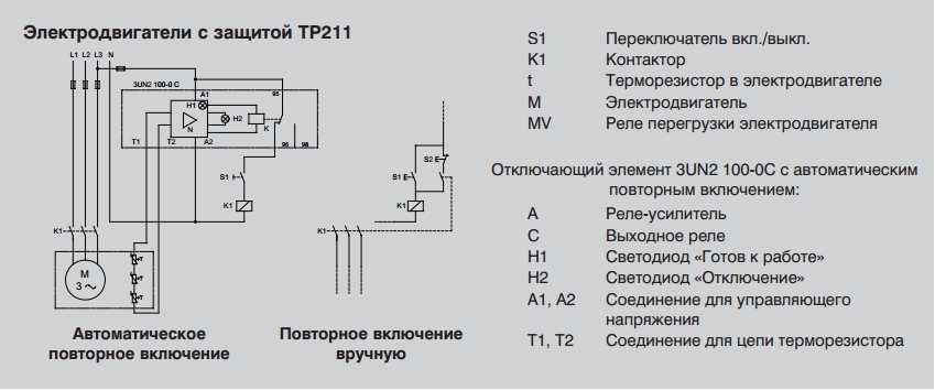На рисунках справа представлены схемы подключения трёхфазного электродвигателя, оснащённого терморезисторами PTC, с расцепителями Siemens. Для реализации защиты как от постепенной, так и от быстрой перегрузки, мы рекомендуем следующие варианты подключения электродвигателей, оснащённых датчиками PTC, с защитой TP 211 и TP 111.