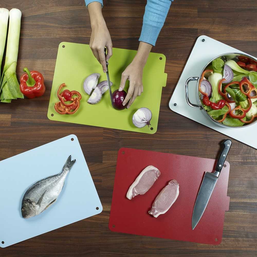 Часто пластиковые доски выпускаются комплектами из изделий разного цвета, что очень удобно для применения. Недостатки: восприимчивость к высоким температурам – от контакта с горячими предметами посуды происходит деформация досок.