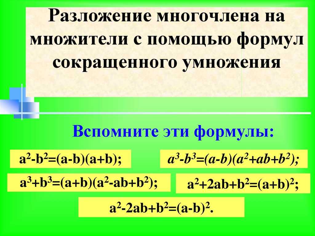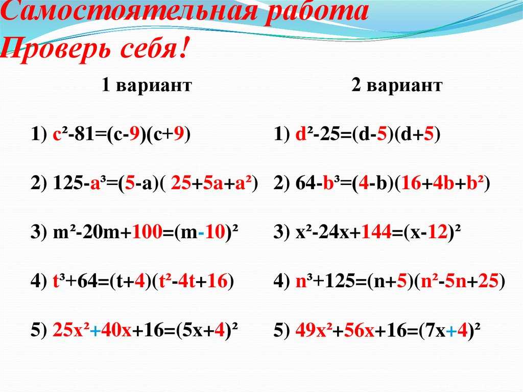 Вывод: в данном уроке мы рассмотрели простейшие комбинации способов разложения многочлена на множители и формул сокращенного умножения и решили много различных примеров на разные варианты этих комбинаций.