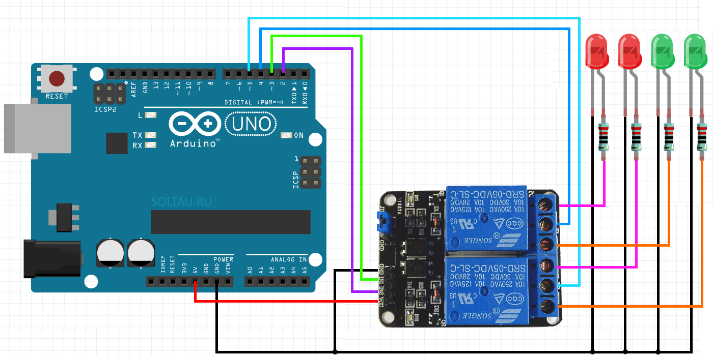В данном примере нам не нужна гальваническая развязка Arduino и модуля реле, поэтому будем питать модуль напрямую от платы Arduino, а джампер оставим на своём месте. Соберём схему, как показано на рисунке. Используемые резисторы — 220 Ом, светодиоды любые.