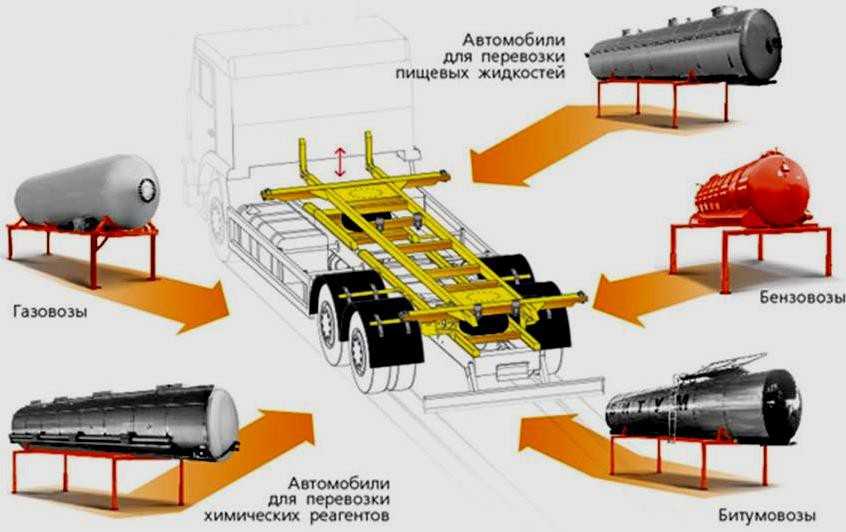 - ж) по типу несущей системы – рамные (цистерна установлена на раме) и несущие (подвески и колеса крепят к цистерне);