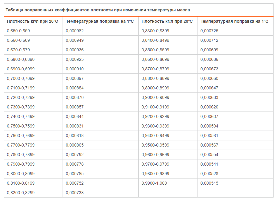 Конечно, при измерении параметров невозможно обеспечить идеальные условия. Контрольные измерения производятся только в лаборатории. Поэтому для корректировки колебаний наружной температуры была разработана таблица плотности масла.