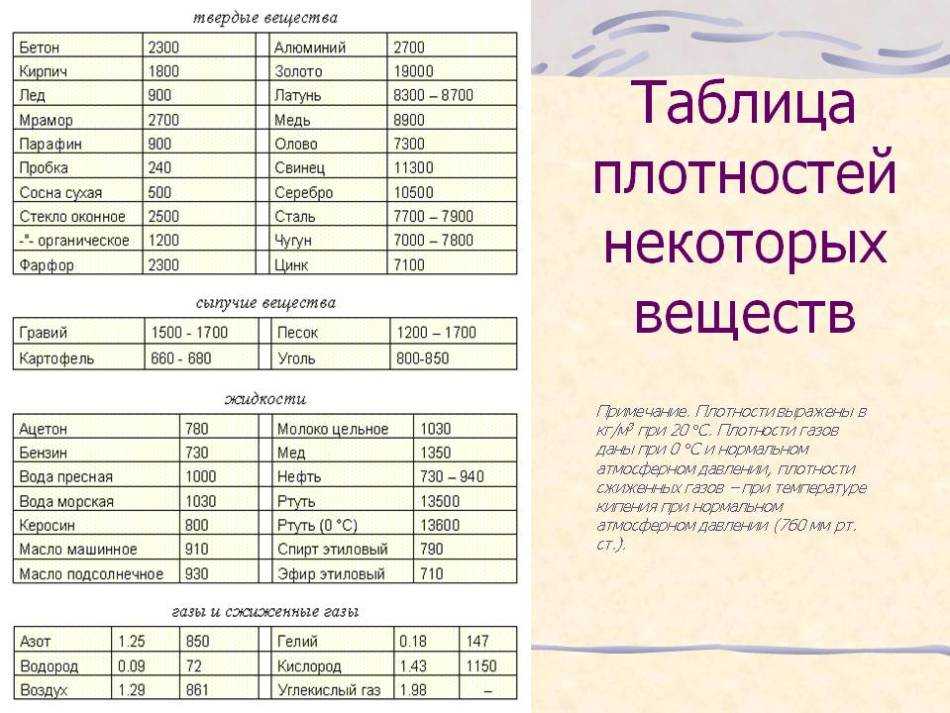 Плотность веществ можно посмотреть в общепринятых таблицах. Вот одна из таких таблиц, которой пользуются строители и другие специалисты:
