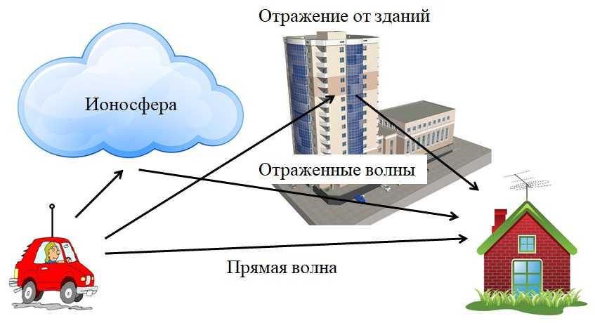 Когда есть источник, есть приемник, есть множество путей распространения радиоволны, одна волна может прийти прямой, другая переотраженной.