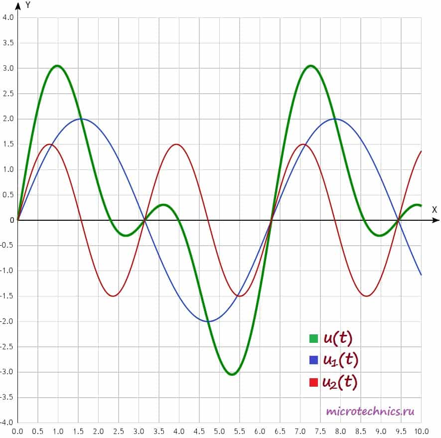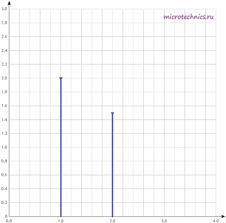 У нас есть две гармоники, амплитуды которых равны, соответственно, 2 и 1.5. Поэтому на диаграмме две линии, длины которых соответствуют амплитудам гармонических колебаний.