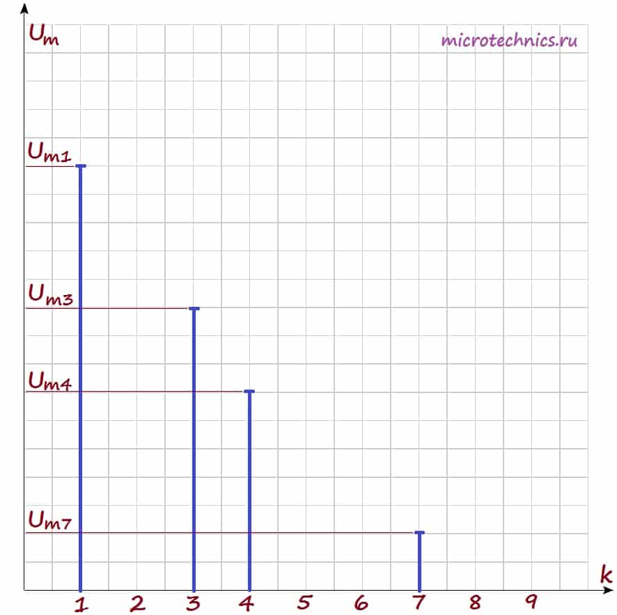 Давайте рассмотрим амплитудный спектр поподробнее. Для визуального изображения спектра используют диаграммы, представляющие из себя набор вертикальных линий определенной длины (длина зависит от амплитуды сигналов). На горизонтальной оси диаграммы откладываются частоты гармоник: