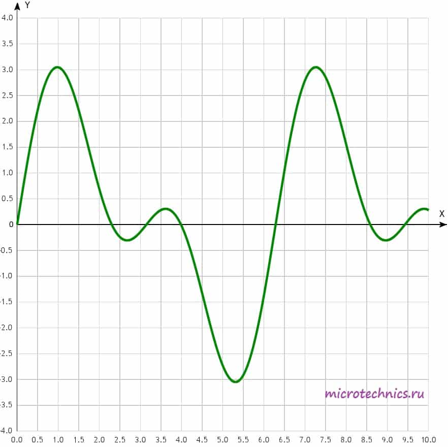 . Суть методики состоит в том, что негармонический периодический сигнал (при выполнении определенных условий) можно представить в виде суммы гармонических колебаний с определенными амплитудами, частотами и начальными фазами. Важным нюансом является то, что все гармонические колебания, которые участвуют в суммировании, должны иметь частоты, кратные частоте исходного негармонического сигнала. Возможно это пока не совсем понятно, так что давайте рассмотрим практический пример и разберемся чуть подробнее Для примера используем сигнал, который изображен на рисунке чуть выше. Его можно представить следующим образом: