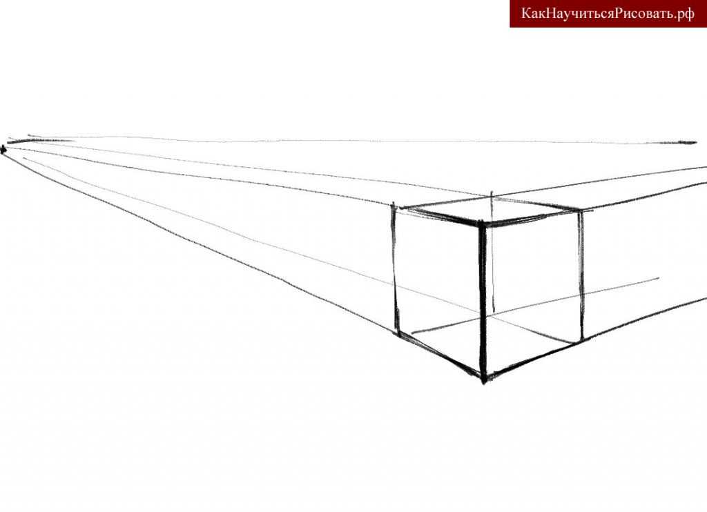 Для построения верхней стороны куба требуется нарисовать линию горизонта. Затем на линии горизонта отметить , которая будет расположена точно посередине ранее нарисованного квадрата. Далее следует соединить два верхних угла квадрата с точкой схода. При рисовании с натуры на следующем этапе нужно измерить соотношение высоты видимой фронтальной стороны куба и видимой верхней стороны. Далее это соотношение перенести на рисунок и отметить дальнюю грань верхней стороны куба. После этого провести горизонталь через полученную отметку до линий, уходящих к точке схода. Если рисуется воображаемый куб, то последние описанные выше действия придется делать на глазок, как подсказывает интуиция.