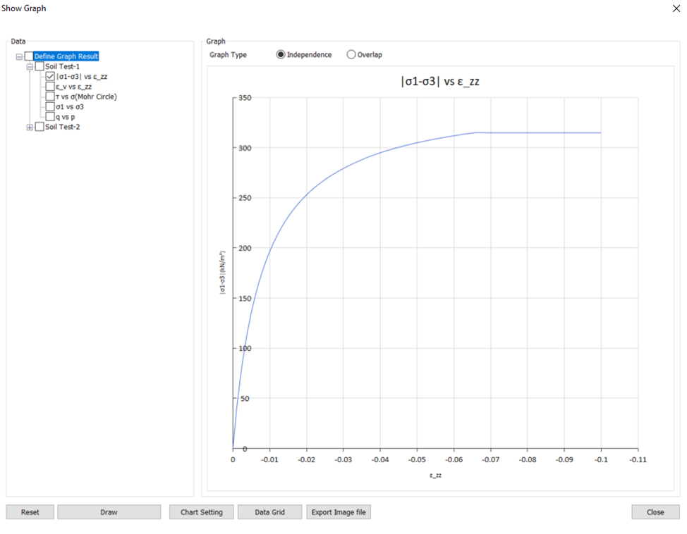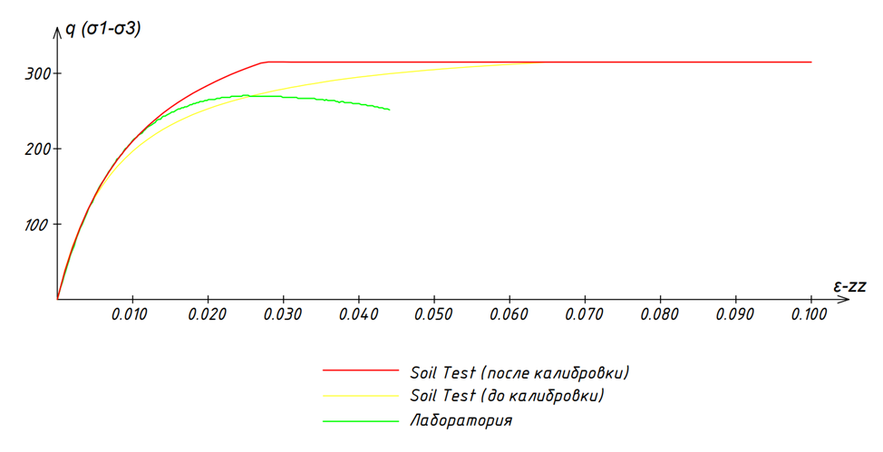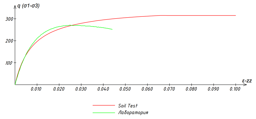 Принцип выполнения калибровки следующий: инженер должен сопоставить график, полученный по результату выполненного лабораторного испытания (в качестве исходных данных у инженера имеются протоколы лабораторных испытаний образцов грунта, в том числе, графики результатов этих испытаний) с графиком моделирования этого испытания в виртуальной лаборатории midas GTS NX с последующим редактированием параметров материала.
