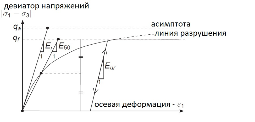 Рисунок 3. Поведение материала в соответствии с моделью «Hardening Soil»