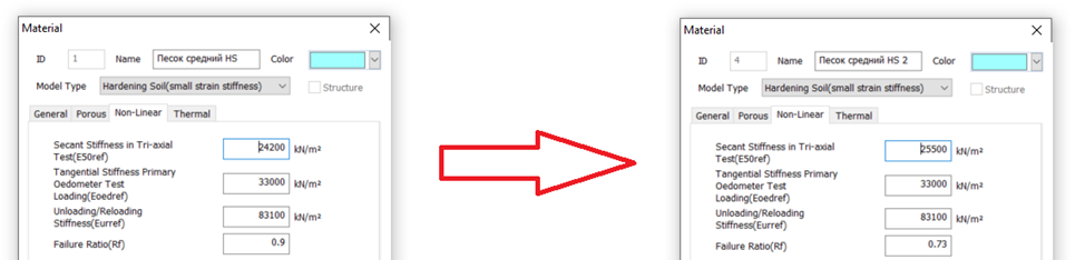 Есть параметры, которые не описаны в ГОСТ, а именно, степенной показатель m. Его можно получить либо по имеющимся результатам трёхосных испытаний, либо по результатам одометрических в зависимости от преобладающей работы грунта. Многие лаборатории определяют его самостоятельно при дополнительном запросе. Также в модели присутствует параметр опорного давления. Этот параметр является давлением начального всестороннего обжатия при трёхосном испытании. Его принимает инженер и передаёт в лабораторию. Также одометрический модуль будет получен по этому давлению. Обычно этот параметр принимается в диапазоне от бытового давления до эксплуатационного для каждого слоя. Параметр коэффициента разрушения также не описан в ГОСТ. Это отношение предела прочности по Мору-Кулону к асимптоте, к которой стремится гиперболическая зависимость. Этот параметр помогает откалибровать модель в midas GTS NX.